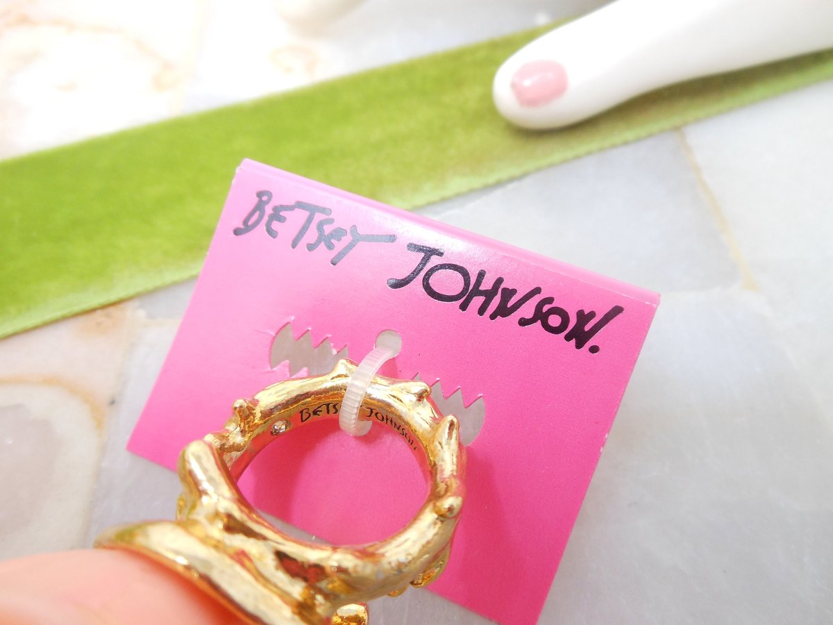 Vintage BETSEY JOHNSON Lucite Ring Plastic Rose Flower Rhinestone Huge Chunky Resin MOD Funky Size 8 Designer Gift, VivianJoel.com
